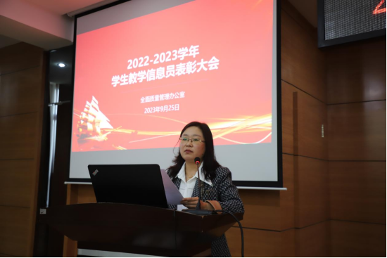 会上,全面质量管理办公室主任孟艳辉对2022-2023学年学生教学信息工作反馈情况总结并充分肯定学校学生教学信息员工作。