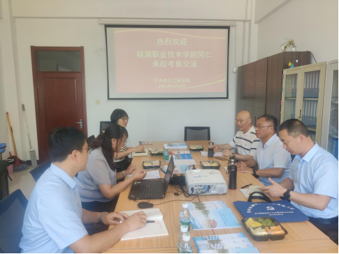 最后,张洪岩副主任对我校课程开发的一、二、三级矩阵做交流汇报,硅湖职业技术学院同仁对此产生了浓厚的兴趣,双方就课程开发与管理一系列问题进行了深入探讨。杨震宇处长对我校高效、灵活的管理模式给予了赞赏,并表示后续校方还会组织教务处等部门人员来校进一步学习交流。