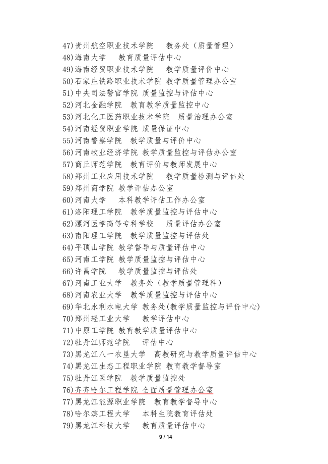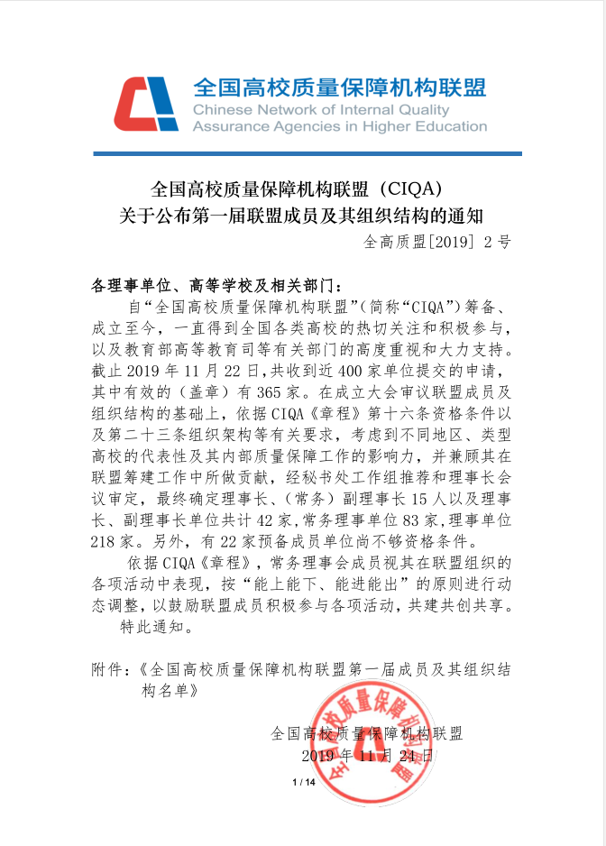 近日,全国高校质量保障机构联盟(CIQA)下发《关于公布第一届联盟成员及其组织机构的通知》(全高质盟[2019]2号),齐齐哈尔工程学院当选CIQA首届理事单位。