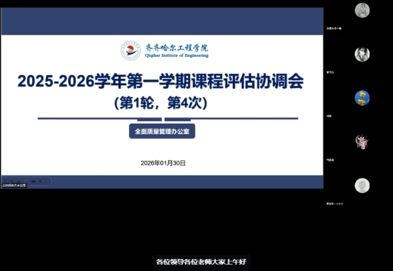 1月30日上午,全面质量管理办公室通过腾讯会议的形式召开2025-2026学年第一学期课程评估协调会,会议由全质办主任孟艳辉主持,课程评估工作组全体成员参加会议。