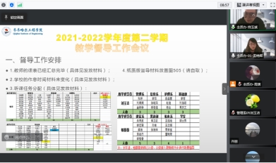 会议中,宫玉斌老师对本学期教学督导工作安排作详细说明,从督导工作的评课覆盖率、督导工作纪律要求、工作内容以及本学期的工作注意事项等方面进行了具体的说明;通过对督导对象进行学情分析,明确本学期教学督导工作的任务与目标。